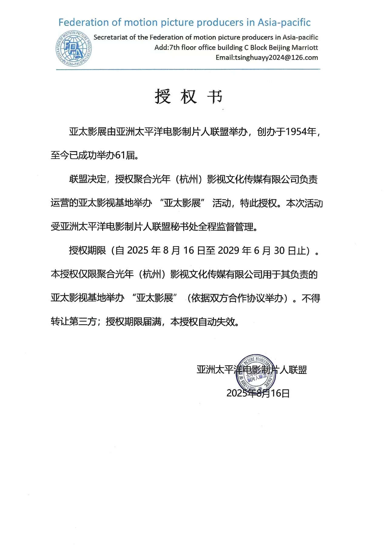 亚洲太平洋电影制片人联盟授权聚合光年(杭州)影视文化传媒有限公司为第62-63-64-65届亚太影展举办方,授权自2025年某月启至2029年某月止。